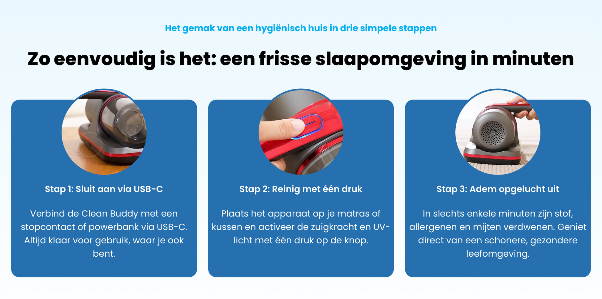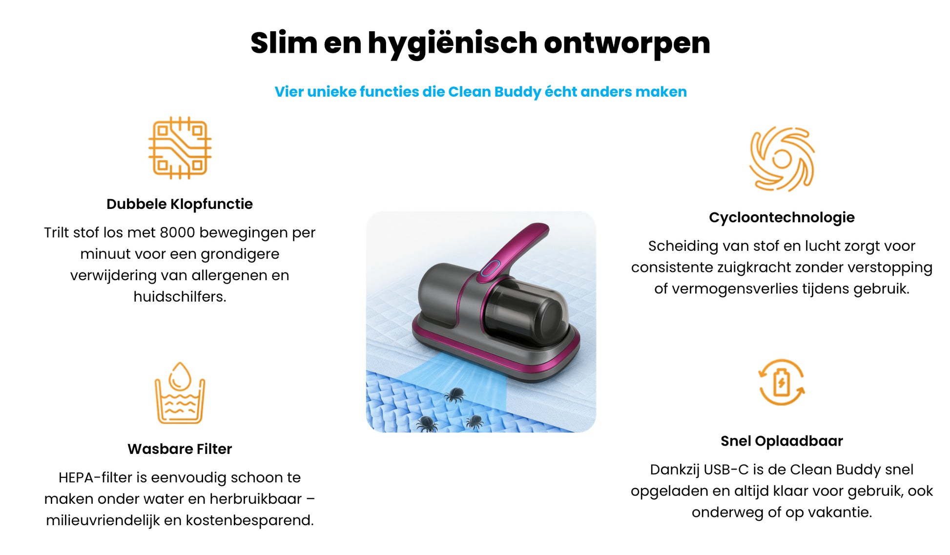 De Clean Buddy is speciaal ontwikkeld om verborgen allergenen, bacteriën en stofmijten aan te pakken in jouw bed en meubels.